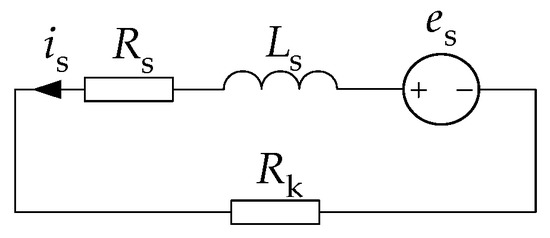 When the ITSC fault occurs in the A-phase winding of a five-phase PMSM, the control system should cut off the A-phase and use the remaining four phases to continue operation through fault-tolerant control. At this time, the A-phase winding current . However, the rotating permanent magnet rotor induces EMF in the short-circuit coil and generates the short-circuit current. The equivalent circuit when short-circuit fault occurs between coil turns is shown in Figure 3. In the figure, and are the short-circuit resistance and the contact resistance at the short-circuit coil respectively; is the self-inductance of the short-circuit coil; is the EMF induced by the permanent magnetic field in the short-circuit coil; is the short-circuit current.