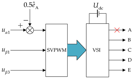 It can be seen from Equation (18) that after adopting the reduced order transformation matrix, the voltage components of the β1 and β3 axes are only related to the switching states . The voltage component of the α1 axis is related to . Therefore, needs to be compensated.