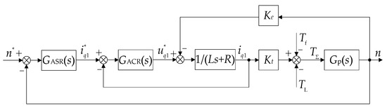 In Figure 5, and are the transfer functions of the speed and current controller respectively; and are the torque factor and the electromotive force factor respectively; is the controlled object, where J is the system inertia and B is the friction factor; and n are the reference speed and actual speed respectively; and are the reference current and reference voltage of the q1 axis respectively. The closed loop transfer function of the current loop can be expressed as: