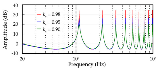 In order to improve robustness, is usually set to a constant less than 1. When and are equal to 0.9, 0.95, 0.98 respectively, the amplitude-frequency characteristic curve of is shown in Figure 8. When the value of is closer to 1, the gain of the controller at the resonance frequency is higher. At this time, the control accuracy of the system will be improved, but the stability will be reduced. In order to reduce the gain of the controller at high frequencies, a low-pass filter is added after the delay part and before the feedback loop. The transfer function of the low-pass filter is as follows:
