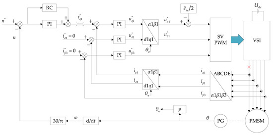 The five-phase PMSM adopts vector control strategy during fault-tolerant control operation. The block diagram of the control system is shown in Figure 5.