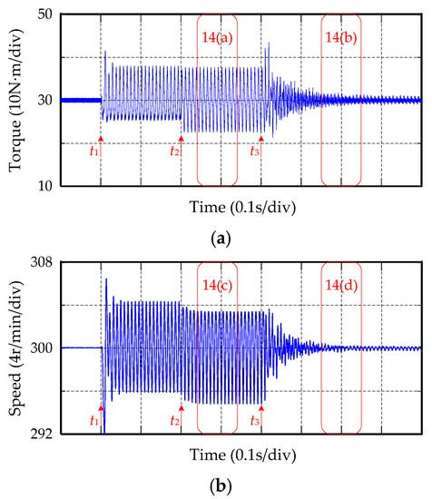 Figure 13 shows the torque and speed waveforms of the five-phase PMSM before and after the ITSC fault occurs in the No. 12 coil of the A-phase winding when the speed is 300 r/min and the output torque is 30 Nm. When the motor is running normally, there is no ripple in the output torque. At t1, the No. 12 coil in Figure 2 has the ITSC fault, and the output torque has ripple component of even-order frequency. Stop supplying power to the faulty phase at t2 so that the faulty phase current is zero. By changing the control mode, the system works in the SVPWM control method under open circuit. The torque ripple at this time is produced by Tsf and Tof together. It can be seen from Figure 14a that the peak-to-peak value of torque ripple is 15 Nm. In order to suppress torque ripple, RC is connected in parallel to the PI controller of the speed loop at t3, and the RC is allowed to perform gain compensation for the speed ripple components. It can be seen from Figure 14b that the torque is relatively stable at this time, and the torque ripple has been effectively suppressed. Figure 13b is the speed waveform before and after an ITSC fault of the A-phase winding. The speed ripple is related to the torque ripple. When the former is greater, the speed ripple is also greater.
