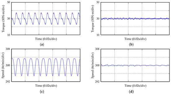 Amplified waveforms of torque and speed of five-phase PMSM: (a) Torque waveform of removing faulty phase after short-circuit; (b) Torque waveform after adding RC; (c) Speed waveform of removing faulty phase after short-circuit; (d) Speed waveform after adding RC.