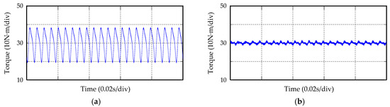 Torque waveform when the speed of five-phase PMSM is 50 r/min: (a) Torque waveform of removing faulty phase after a short-circuit; (b) Torque waveform after adding RC.