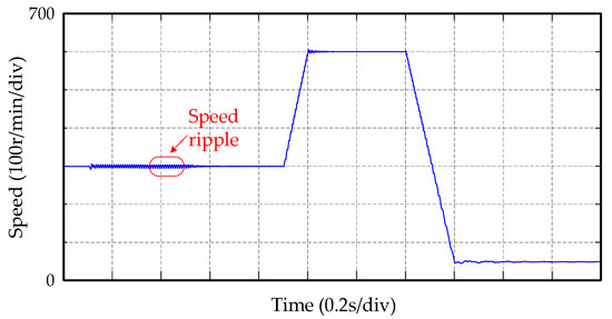Figure 18 shows the speed waveform of the motor working at different speeds. The existence of torque ripples will cause speed ripples. When the motor works with healthy four-phase windings, and RC is connected in parallel to the speed controller, the speed ripple is suppressed. When the motor speed change, the speed ripple frequency will also change. Now the speed ripple is non-periodic, so RC will output wrong reference current signal. Let the PI controller act alone at this time. When the motor reaches reference speed, add RC again and let RC and PI controller work together. It can be seen from Figure 18 that the speed waveform is relatively stable after adding RC, and there is no obvious ripple component.