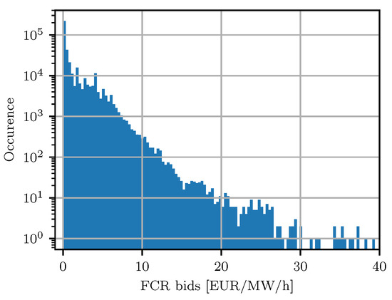 Histogram of all accepted FCR bids on the Regelleistung platform. Data from the 1 July 2019 up to and including the 30 September 2020 [18].