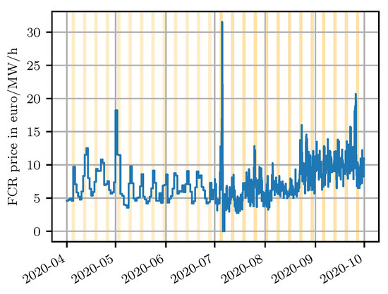 Time series of the FCR cross border marginal price on the Regelleistung platform Data from 1 April 2019 up to and including the 30 September 2020 [18]. Weekend days are indicated with orange bars.