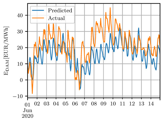Considering both the given facts of multiple periodicities and impact of external regressors, a choice of method needs to be made. A Trigonometric seasonality, Box-Cox transformation, ARMA errors, Trend and Seasonal components (TBATS) model allows for multiple periodicities to be included but has as major drawback that no external regressors can be included. Considering the importance of the latter in the DAM pricing, it is decided to create a short-term Belgian DAM price prediction model by using the SARIMA with eXogenous factors (SARIMAX) method. As the SARIMAX method only allows for a single direct periodicity, a second periodicity is included indirectly by using Fourier terms. As exogenous parameters the actual wind and PV production as well as the grid load are added. The latter are considered to be known, i.e., the uncertainty of future wind and PV production are not taken into account here. The historical data for the external regressors are obtained from Elia [31,32,33] and data on historical DAM prices are obtained from the ENTSO-E transparency platform [34]. The model is trained based on a dataset ranging from the 1 June 2019 to the 30 May 2020, with June 2020 serving as test dataset. Identical to the FCR price prediction model the pmdarima package in Python is used. The resulting best fitting model is a SARIMAX(3,1,2)(2,0,2,24). Figure 4 shows the actual and predicted DAM prices during a part of the testing period. An RMSE of 10.16 is obtained (The MAPE is not calculated because it is considered to be not representative since the dataset contains negative and zero prices). The model shows to grasp periodicities as well as encompassing the part of the variability of the exogenous parameters, nevertheless forecast errors are still present. The Auto-Correlation Function (ACF) and Partial Auto-Correlation Function (PACF) plots of the residuals show remaining lags within the significance bands, hinting that a higher-order SARIMAX model might provide a better prediction. Nevertheless, based on the AIC, no improved SARIMAX model is found. To investigate the potential heteroscedasticity of the time series, the residuals are subjected to Engle’s Test for Autoregressive Conditional Heteroscedasticity (ARCH), as implemented in the Python statsmodels package [35]. The null hypothesis is confirmed, i.e., the residuals are found to be homoscedastic, and no ARCH term is considered to improve the model.