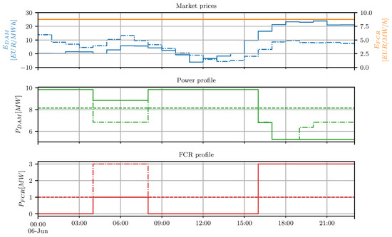 Maximisation of the cost function f as defined in (9) is only possible in case a value for each parameter is available. As explained in Section 2 future prices of energy and ancillary service markets are not known in advance and are prone to forecasts. A SARIMA(X) model for the FCR and DAM prices is constructed and used as deterministic price input for and respectively. For the DAM SARIMAX model, the actual data for wind, PV and load are used, as obtained from Elia [31,32,33]. The optimisation where the predicted FCR and DAM prices are used is termed the forecast scenario. The constrained optimisation problem is defined in the Pyomo language, which is a Python based, open-source optimisation modelling language [43]. For optimisation, the BONMIN solver from the open-source Coin-Or project is used [44].