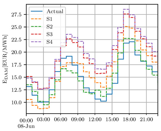Example of defined scenarios (dashed lines) and actual DAM price.