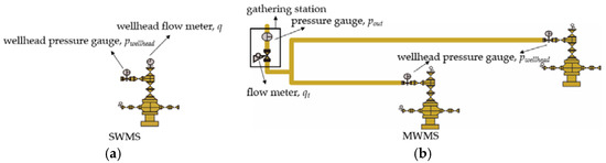 In recent years, great progress has been made in gas exploitation in China [1,2]. The gas fields in China have increasingly replaced the single-well-monitor system (SWMS) with the multi-well-monitor system (MWMS) to reduce the wellhead costs. Figure 1 compares the schematic of the SWMS to that of the MWMS. As one can see in Figure 1a, the wells of the SWMS are equipped with a wellhead pressure gauge and wellhead flow meter, such that the wellhead pressure pwellhead and the production rate q can be measured. However, the wells of the MWMS are only equipped with a wellhead pressure gauge. The production is transported to a gathering station where the total production rate qt and the outlet pressure pout are measured. Therefore, in an MWMS, the production rate of each single well is unknown. In practice, the production data of each single well plays an important role for one to estimate the ultimate recovery and optimize the production strategy. Hence, it is crucial for the industries to split the production of the MWMS.