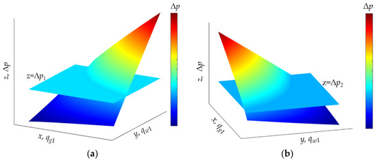 Figure 4. Intersection between the planes of z = ∆p1 and z = ∆p2 and the pressure-loss planes: (a) the first pipe; (b) the second pipe. - Figure 5a,b shows the x–y plane view of the possible-value lines of the two pipes, as shown in Figure 4. It should be noted that a reasonable value of qg1 and qw1 should ensure that the pressure loss of the first pipe equals to ∆p1 and the pressure loss of the second pipe equals to ∆p2. For example, (qgi, qwi) indicates a point on the intersection line in Figure 5a but not on the intersection line in Figure 5b. This indicates that flow rate pair (qgi, qwi) can lead to a pressure loss of ∆p1 for the first pipe, but it cannot lead to a pressure loss of ∆p2 for the second pipe. Therefore, this flow rate pair is not reasonable. The reasonable flow rate pairs can be found by intersecting the possible-value line in Figure 5a and the possible-value line in Figure 5b, as shown in Figure 5c;