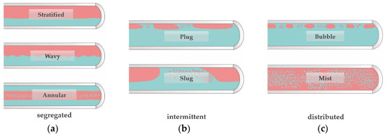 Schematics of different flow patterns: (a) segregated flow; (b) intermittent flow; (c) distributed flow.