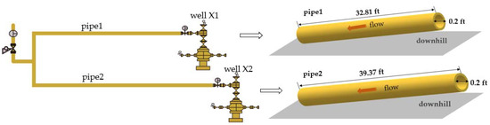 In this section, we applied this proposed method to an MWMS in the Hechuan Gas Field in China. The gas production Wells X1 and X2 are in the same well group, and the production of these two wells are transmitted with two separate pipes. The properties of the pipes and the schematic of the MWMS are shown in Table 1 and Figure 9.