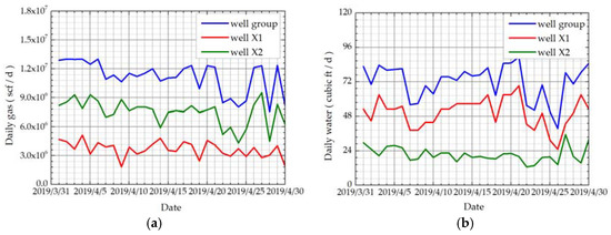 The (a) daily gas production data and (b) daily water production data of the well group for 30 days.