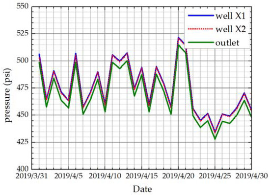 Figure 10 shows the gas production rate of Well X1, X2, and well group of 30 days, as shown in Figure 10a, and the water production rate of X1, X2, and well group of 30 days, as shown in Figure 10b. Figure 11 presents the wellhead pressure of these two wells, as well as the outlet pressure of 30 days. Therefore, we can split the production of these two wells with the proposed method by use of the total gas and water production rate together with the wellhead pressure and outlet pressure. Subsequently, this proposed method can be validated by comparing the calculated results to the real measured data. In order to conduct a more thorough comparison, we also use the commercial software PIPESIM to split the production.
