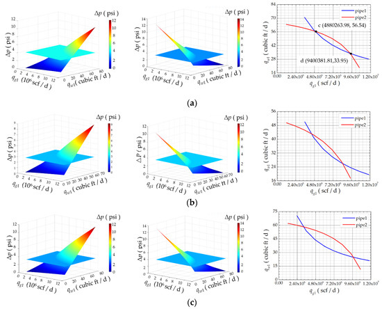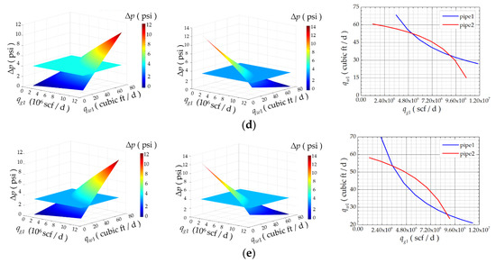 - Graphing the pressure loss of the two pipes with these flow rate pairs in 3D graphs, as shown in Figure 3. Figure 3a,b shows the pressure loss graphs of the first pipe and the second pipe, respectively. In Figure 3a,b, the x-axis represents the gas flow rate of the first pipe qg1, the y-axis represents the water flow rate of the first pipe qw1, and the z-axis represents the pressure loss ∆p;