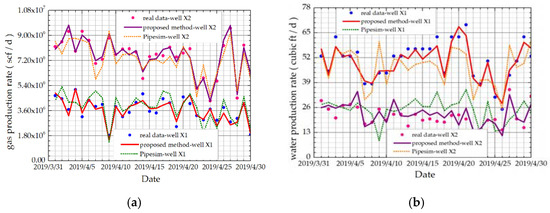 Figure 13 demonstrates the calculated results from this proposed method, the calculated results from PIPESIM, and the real field data. Figure 13a,b shows the gas production and water production of the two wells, respectively. As one can see in Figure 13, that although both the results from the proposed method and those from PIPESIM undergo good agreement with the real field data for splitting the gas production, as shown in Figure 13a, this proposed method exhibits a better performance than PIPESIM for splitting the water production, as shown in Figure 13b.