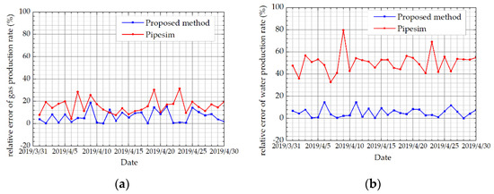The relative errors of this proposed method and those of PIPESIM: (a) relative error of gas production rate; (b) relative error of water production rate.