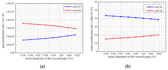 Calculation results under different inner diameter of pipes: (a) gas production rate; (b) water production rate.