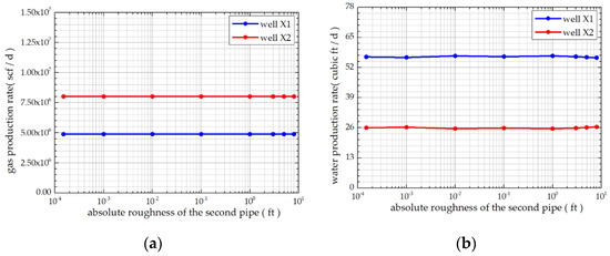 Calculation results under different absolute roughness of pipes: (a) gas production rate; (b) water production rate.
