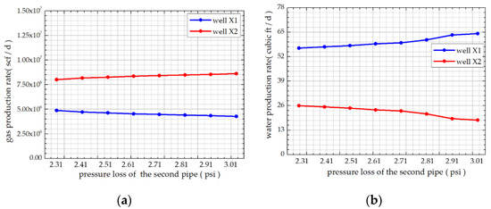 Figure 17 shows the gas and water production rates of the two wells with a different pressure loss of the second pipe. As we have stated in Section 4.1, the pressure loss is mainly caused by the gas flow, and a larger pressure loss indicates a higher gas flow rate of the pipe. Therefore, in Figure 17 we can find that the gas flow rate is increased, while the water flow rate is decreased as the pressure loss of the second pipe is increased.