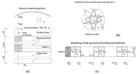 Starting from lack of EnergyPlus, the Capacity and Resistance Model (CaRM) [34] was used in this work to simulate the borehole field. CaRM can be easily modified and adapted to a given variation of the investigated case study. The model uses the analogy with an electrical network to solve the transient heat conduction problem into the ground, grouting material and piping network. As shown in Figure 1, the model considers the heat conduction along both depth and radial direction as well as the heat balance on the ground surface in terms of convection and short- and long-wave radiation contributions. The domain is divided in three main zones: (i) the surface, (ii) the borehole and (iii) the deep zone. In each zone, an appropriate heat transfer model is implemented—in the surface and deep zones, the heat transfer is modeled only along the depth direction, whereas in the borehole zone (i.e., the zone surrounding the borehole heat exchanger) the heat transfer is modeled along both the radial and depth directions. A significant feature of CaRM is the consideration of the thermal capacitance of the both heat-carrier fluid and grouting material, therefore sub-hourly computer simulations can be carried out. The domain is divided in several thermal nodes for which the heat balance equations are written, obtaining a linear system of n equations in n unknown terms (i.e., the temperature of each thermal node).