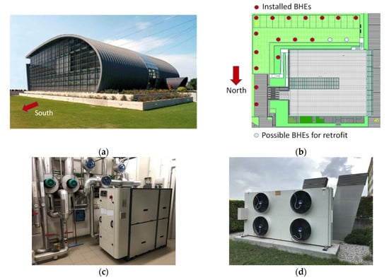 Case study: (a) building, (b) layout of the installed boreholes, (c) new heat pump, (d) air-condenser.