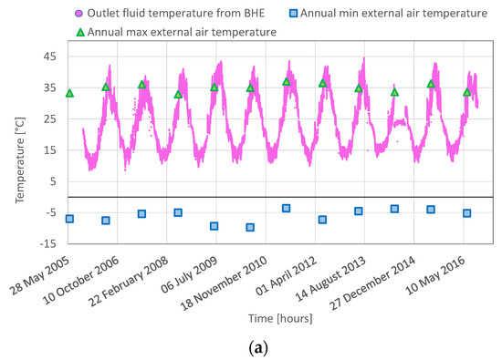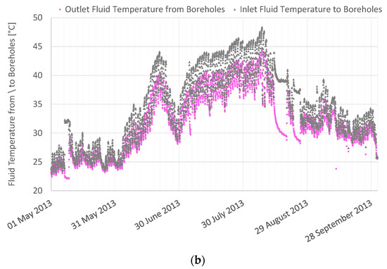 Measured hourly fluid temperature: (a) outlet fluid temperature from borehole heat exchangers with annual minimum and maximum external air temperatures, (b) inlet and outlet fluid temperature to/from borehole heat exchangers from May to September 2013.