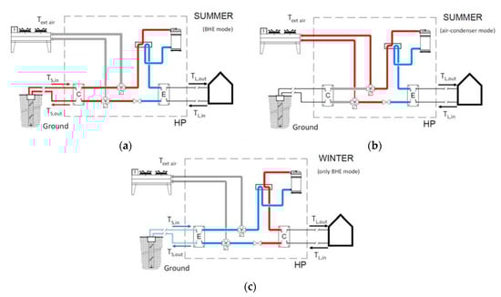 Scheme of the new hybrid heat pump: (a) operation in cooling mode using borehole heat exchangers; (b) operation in cooling mode using air-condenser; (c) operation in heating mode using borehole heat exchangers.