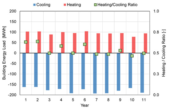 The heating and cooling demands of the building were calculated by means of the EnergyPlus tool over eleven years using real weather data provided by the regional environmental agency ARPAV [37] for the weather station of Legnaro (at about ten kilometers from the building). Figure 5 shows the calculated annual energy loads of the heat pump from 2005 to 2016. As can be observed, the ratio between the annual heating and cooling energy demand ranges from 0.65 initially, to 0.49 at the end of the considered period. This confirms that the building’s annual load profile is cooling dominant. The interested reader will find additional details on the building thermal load calculation in the reference [38].