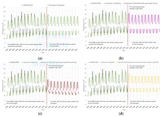 Mean monthly outlet fluid temperature from the borehole heat exchangers: measured values from 2006 to 2017; simulated values in (a) Scenario 1, (b) Scenario 2, (c) Scenario 3, (d) Scenario 4.