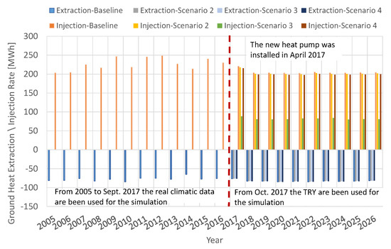 - Scenario 2—Retrofit with new Heat Pump: the change of the water-to-water heat pump was implemented from April 2017, maintaining the actual borehole field;