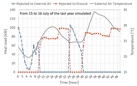 Hourly profiles of the heat load rejected to the ground and the external air during the 15 and 16 July of the last simulated year in Scenario 3.