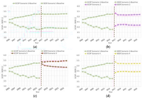 Seasonal energy efficiency of the heat pump: simulated values in (a) Scenario 1, (b) Scenario 2, (c) Scenario 3, (d) Scenario 4.