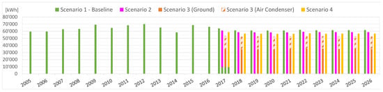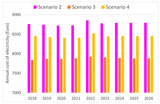 From the electricity bills of the building, the average price of the electricity is 0.15 EUR/kWhel (excluding VAT). As a consequence, the annual cost of the electricity consumption for each retrofit scenario can be evaluated considering the results of the previous simulations. Figure 11 reports the annual electricity cost for Scenarios 2, 3 and 4 from 2018 to 2026 due to heat pump consumption. The total operation costs from 2018 to 2026 are: EUR 78.959 for Scenario 2, EUR 70.945 for Scenario 3, and EUR 76.013 for Scenario 4. The operation cost savings of Scenarios 3 and 4 compared to Scenario 2 are about 10% and 4%, respectively. The hybrid solution (Scenarios 3) shows the lower annual cost for operating conditions, with an economic saving of about 890 EUR/year compared with Scenario 2 and about 560 EUR/year compared with Scenario 4 (i.e., the ground source heat pump with two additional boreholes). Considering in any case necessary the change in the machine (Scenario 2) and taking into account the differences between the initial costs reported in Table 4, a simple pay-back time of the hybrid solution of Scenario 3 compared to Scenario 2 is about 12 years, while the pay-back time of Scenario 4 compared to Scenario 2 is about 31 years. Additionally, evaluating the benefit of lowering the ground temperature—with all things considered—the solution of Scenario 3 was the one adopted.