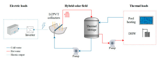 The LCPV/T plant was evaluated under the TRNSYS software environment. The hybrid plant comprised 144 hybrid collectors, i.e., 12 rows each with 12 collectors, which covered a total roof area of 1281 m2. The hybrid collectors were based on a small-sized parabolic trough with a triangular receptor that had c-Si back-contact solar cells attached on the receiver sides that collected concentrated sunlight. The hot water produced by the plant will be used to cover the following part of the thermal demands of the building, i.e., domestic hot water (DHW), and pool heating. The electrical production, however, was only considered an additional energy input to the building electricity consumption, which will be accounted for by monetary and environmental gains. A simplified process diagram of the simulated system is shown in Figure 1. Energy plus weather files were used to simulate a typical meteorological year for the studied location.