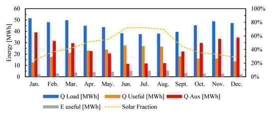 Monthly thermal (Q Useful) and electrical (E useful) yields of the solar hybrid plant, thermal demand (Q Load), auxiliary heat (QAux), and solar fraction (Source: Author’s own calculation).