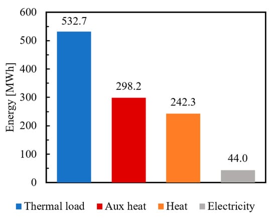 - The term Qeq represents the annual equivalent heat produced by the hybrid plant considering the conversion factor from electricity to heat to be 1, which resembles the efficiency of an electric resistance (ER) water heater [30];