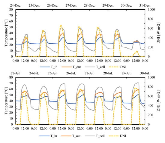 Temperature profile of the LCPV/T plant and DNI during the typical weeks of winter (top) and summer (bottom) (Source: Author own calculation).