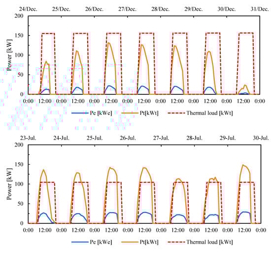 Finally, as shown in Figure 5, the highest recorded values of the thermal and electrical powers during a typical summer day were 148.9 and 29.1 kW, respectively. For the winter season, the thermal and electrical peak values obtained were 131.5 and 21.79 kW, respectively.