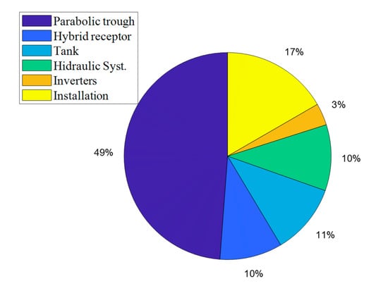 From Figure 6, we can see the following: the total cost of the hybrid collectors represents 59% of the initial investment; the balance of system components (tank, hydraulic system, inverters, and storage tank) represents 24% of the downpayment; the installation cost has 17% share in the total cost. Additionally, the hybridization of the local parabolic trough technology represents 13% of the total initial investment of the solar plant.