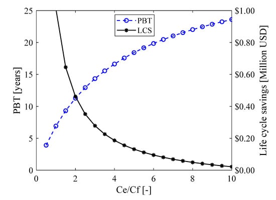 The economic performances of the hybrid plant and conventional heat and power generation, respectively, are presented in Table 3. The electricity price to natural gas price ratio obtained is 5.68, which clearly shows a remarkably low price of natural gas, despite the fact that electricity tariff in Monterrey is lower than those in other regions in Mexico. This price ratio is 16.4% greater than the highest one (i.e., 4.88), which was reported by [28] (Italy). Figure 7 plots the PBT and annual savings of the hybrid plant as a function of the energetics price ratio Ce/Cf. Notably, a better economic performance of the hybrid plant in terms of PBT and life cycle savings is achieved as the energetics price ratio approaches one. A PBT lower than 10 years can be achieved when the energetics ratio is less than 2, with that too maintaining a relatively high electricity tariff. Because the thermal production of the hybrid plant surpassed the electrical production by nearly fivefold (see Figure 3), the savings generated by heat production prevailed upon the ones generated by electricity. Therefore, the economic performance of the hybrid plant mainly depends on the fuel to be displaced and on its price. Nevertheless, as will be further presented in this study, the added value of electricity generation is relevant in this technology, and it can be assessed from the economic perspective and strictly depends on the local prices of electricity.
