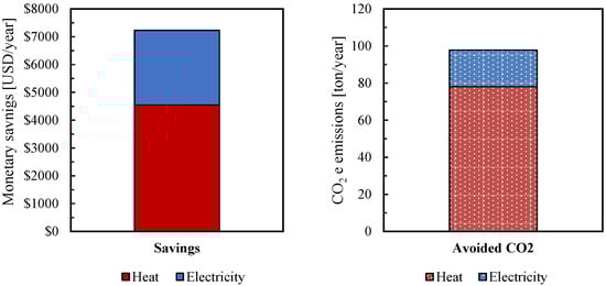 The annual monetary savings and environmental benefits owing to the clean energy production of the hybrid solar plant are shown in Figure 8. Notably, the hybrid plant can annually generate 7183 USD of monetary savings, accounting for the heat and electricity generation. The majority of the monetary savings is attributed to the heat generation by the solar plant, accounting for 62.9% of the total. Nevertheless, the savings attained by electricity generation of the plant also represent a significant quota, despite the fact that the hybrid plant produced a diminished amount of power in comparison with that of heat.