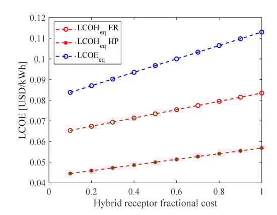 Because the final price of the hybrid receptor has not been yet established, a sensibility analysis of the levelized cost of energy as a function of the receptor fractional cost (RFC) was conducted. From Figure 9, we can notice that both LCOEeq and LCOHeq ER increase as the receptor fractional price increases. Nevertheless, LCOHeq ER increases at a slower pace (USD 0.022 per RFC) than LCOEeq (USD 0.03 per RFC). This difference is attributed to the following reasons: (1) the savings associated with heat production prevail over those associated with electricity, (2) the LCOHeq approach considers that electricity transforms into heat with a conversion factor of 1. If the heat pump COP is considered for the LCOHeq calculation (LCOHeq HP), the slope of the curve decreases to USD 0.014 per RFC. From these results, we can conclude that to have a levelized cost of heat (LCOHeq ER) lower than the one obtained with a conventional system, the hybrid receptor cost should not be higher than 22% of the cost of the parabolic trough reflectors.