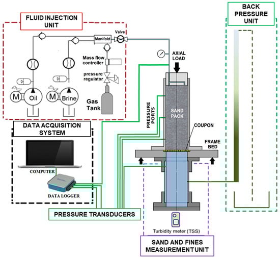 An axial load of 60 psi was applied over the top of the sample by a platen to prevent sand-pack fluidization during the test. The fluid injection system consists of two pumps for oil and brine injection and one nitrogen gas cylinder. During the flow test, all fluids were injected from the top of the sample toward the coupon at room temperature. The produced sand sample was collected and measured by the sand trap located below the coupon. The back-pressure column was connected to the sand trap to provide around three psi back-pressure to the system for the sample saturation and liquid discharge during the test.