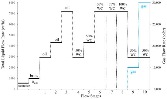 Figure 7 shows a testing procedure designed to enable the inclusion of the fluid velocity and fluid phase into the design criteria. The test starts with a single-phase oil flow to emulate the preheat stage of SAGD operation, in which only melted bitumen flows towards the production well. The next five testing stages consist of two-phase flow (oil and brine) with gradually increasing water cut levels. These five stages emulate the condensed steam production and the bitumen with a gradual increase in water production over the life of the SAGD well. The last two flow stages consist of three-phase flow that mimics the potential steam-breakthrough at two different steam flux levels. Different flow rate levels are included to analyze the impact of fluid velocity on the liner performance and design criteria. It has been found that there are non-uniform flow distribution and plugging of slots in SAGD wells [45]. The elevated flow rates, shown in Figure 7, account for such conditions. The flow rates used in the tests represent typical SAGD production rates [46,47].