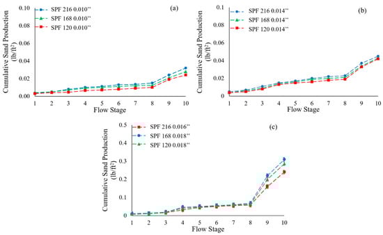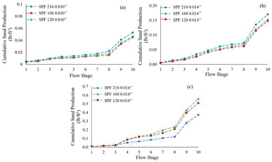 Produced sand results for DC-I using slot apertures of (a) 0.010′′, (b) 0.014′′, and (c) (0.016′′) 0.018′′.
