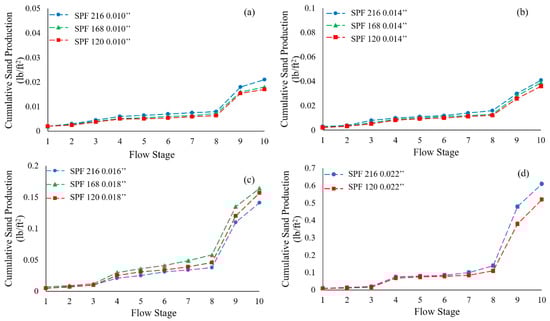 Figure 8, Figure 9 and Figure 10 present the overall cumulative sand production for DC-I, II and III, respectively. It is found that the amount of sand production increases with the increase of slot size and slot density for all three sand types. However, the slot size plays a more critical role in sand production than the slot density. Besides, for the same coupon specifications and testing conditions, the sanding is higher for finer PSD (DC-I). Additionally, there is only a minor sanding for the single-phase oil flow (Stages 1–3), attributed to the strong capillary bonding in the sand-pack [48,49]. However, water injection in the next stages increases water saturation and reduces capillary bonding, resulting in higher sand production (Stage 4). Stages 5–8 also involves higher fluid velocities; hence, stronger drag forces on the sand grains and more sanding (Stages 5–8).