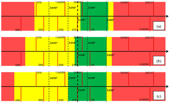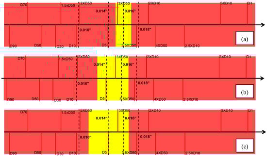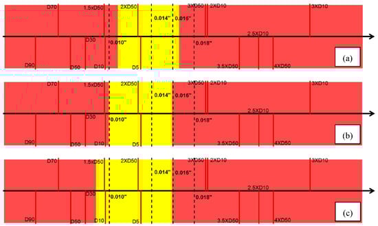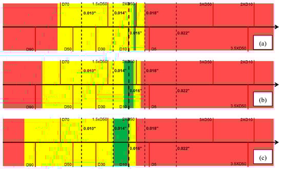 Another finding is with the increase of slot density, the yellow windows in DC-I becomes wider and shifts to the left (Figure 11). A similar observation is made for DC-II and III (Figure 13 and Figure 15), attributed to the increase of the open-flow-area leading to a higher sanding and retained permeability. Thus, both the upper and lower bound of the safe window shift to the left. It is also found that the upper bound of the safe aperture windows for all three PSD types become smaller to keep sanding within the acceptable level during the SAGD steam breakthrough. The finding is justified with the additional sand production caused by the steam breakthrough, which needs to be mitigated by using a narrower slot size. Thus, the design window shrinks for the aggressive SAGD operational conditions compared to the normal SAGD condition.